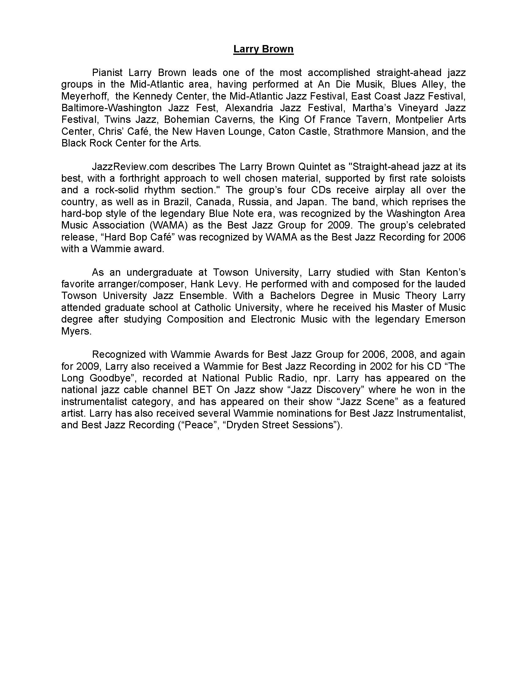 JazzReview.com describes The Larry Brown Quintet as "Straight-ahead jazz at its best, with a forthright approach to well chosen material, supported by first rate soloists and a rock-solid rhythm section." The group’s four CDs receive airplay all over the country, as well as in Brazil, Canada, Russia, and Japan. The band, which reprises the hard-bop style of the legendary Blue Note era, was recognized by the Washington Area Music Association (WAMA) as the Best Jazz Group for 2009. The group’s celebrated release, “Hard Bop Café” was recognized by WAMA as the Best Jazz Recording for 2006 with a Wammie award.